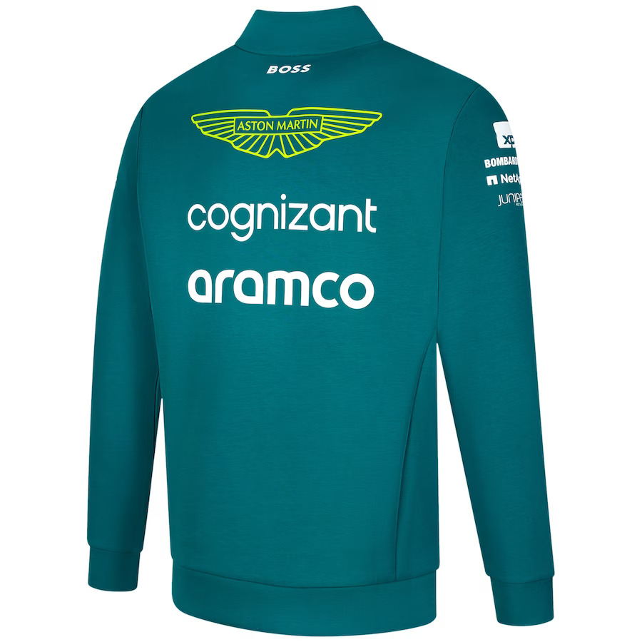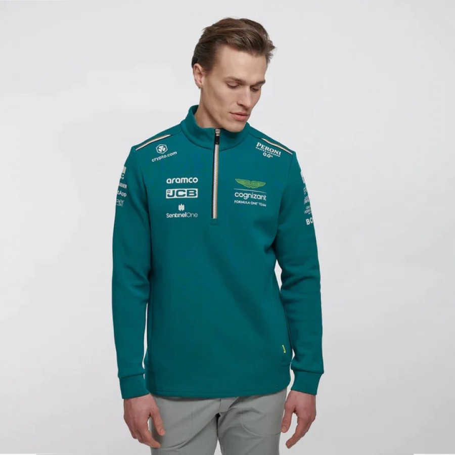 Official Aston Martin F1 Team Mid Layer sweatshirt of the Formula 1 team for the 2023 season. With the Aston Martin logo printed on the front and prominently on the back, this sweatshirt will delight fans of the brand on colder days.