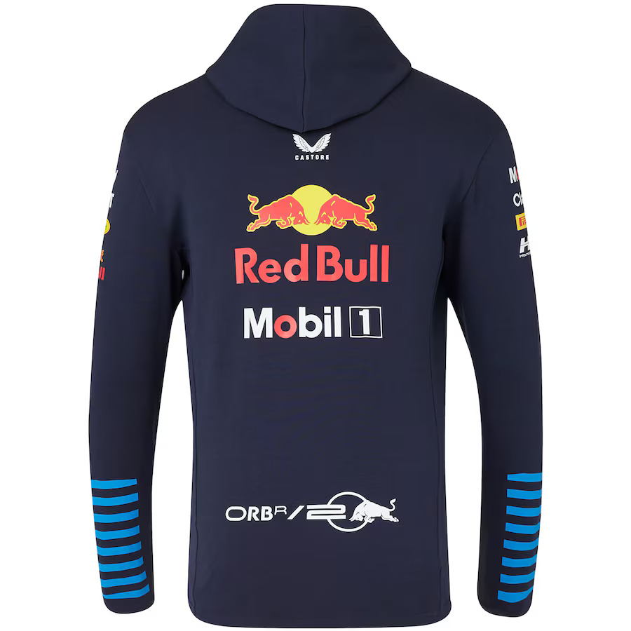 The official 2024 Red Bull Racing Team Zip Hoodie, designed and produced by Castore. Complete with full length zip, adjustable drawstring hood, and precision printed team and sponsor logos as seen across the Red Bull Racing Teamline range during the 2024 F1 season.