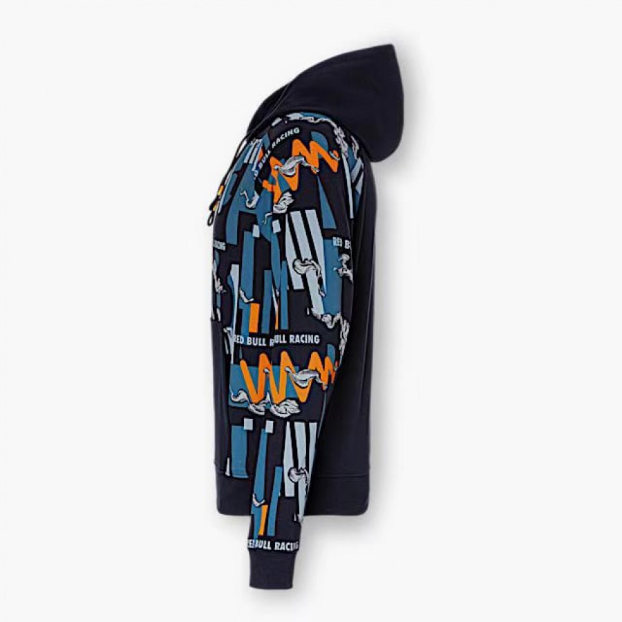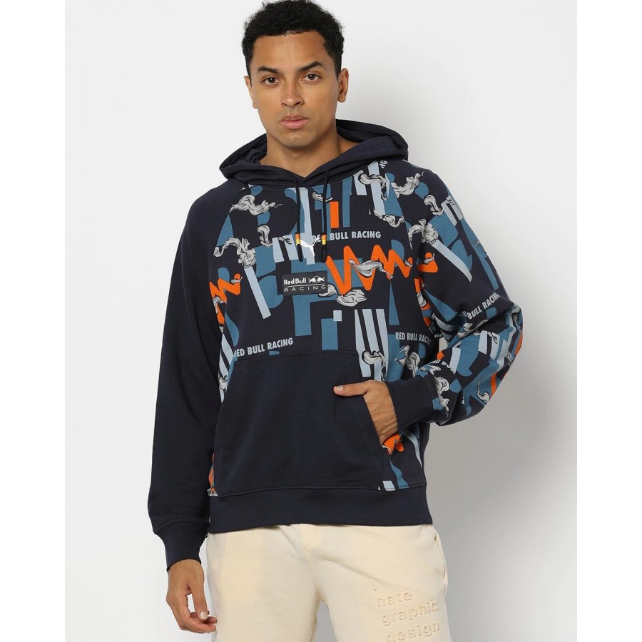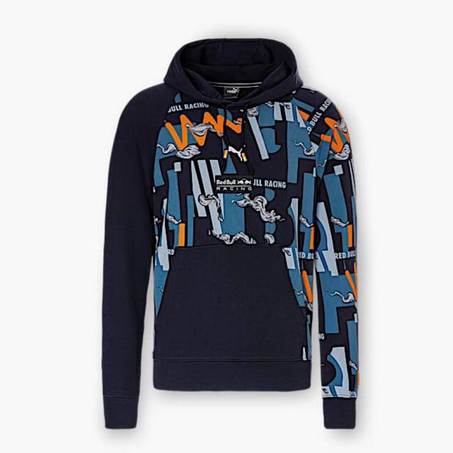 The official Red Bull Racing Mens Team Hoodie 2022, adjustable drawstring hood, and precision printed team and sponsor logos as seen across the Oracle Red Bull Racing range. It is a navy blue pullover hooded sweatshirt that is part of the official Red Bull Racing F1 merchandise collection.