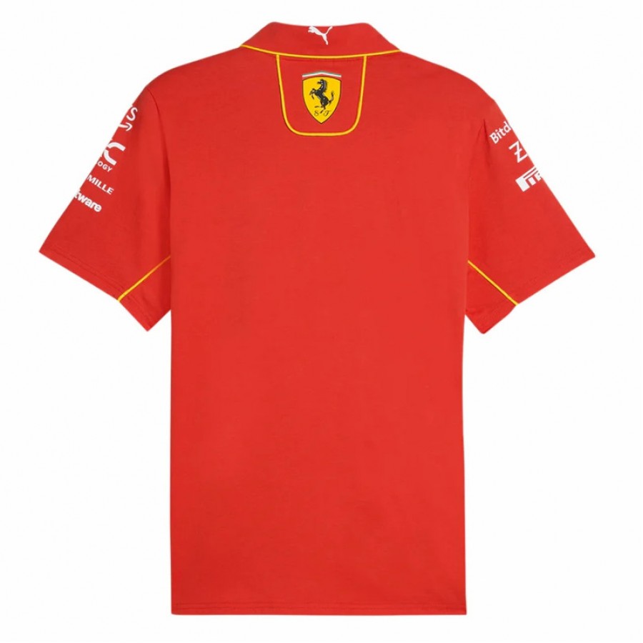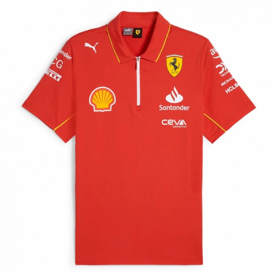 The official PUMA 2024 Scuderia Ferrari Team Polo. Features the same team race suit inspired yellow piping and details as seen throughout the 2024 team collection, alongside all the official team and sponsor branding from the 2024 Formula 1 season.